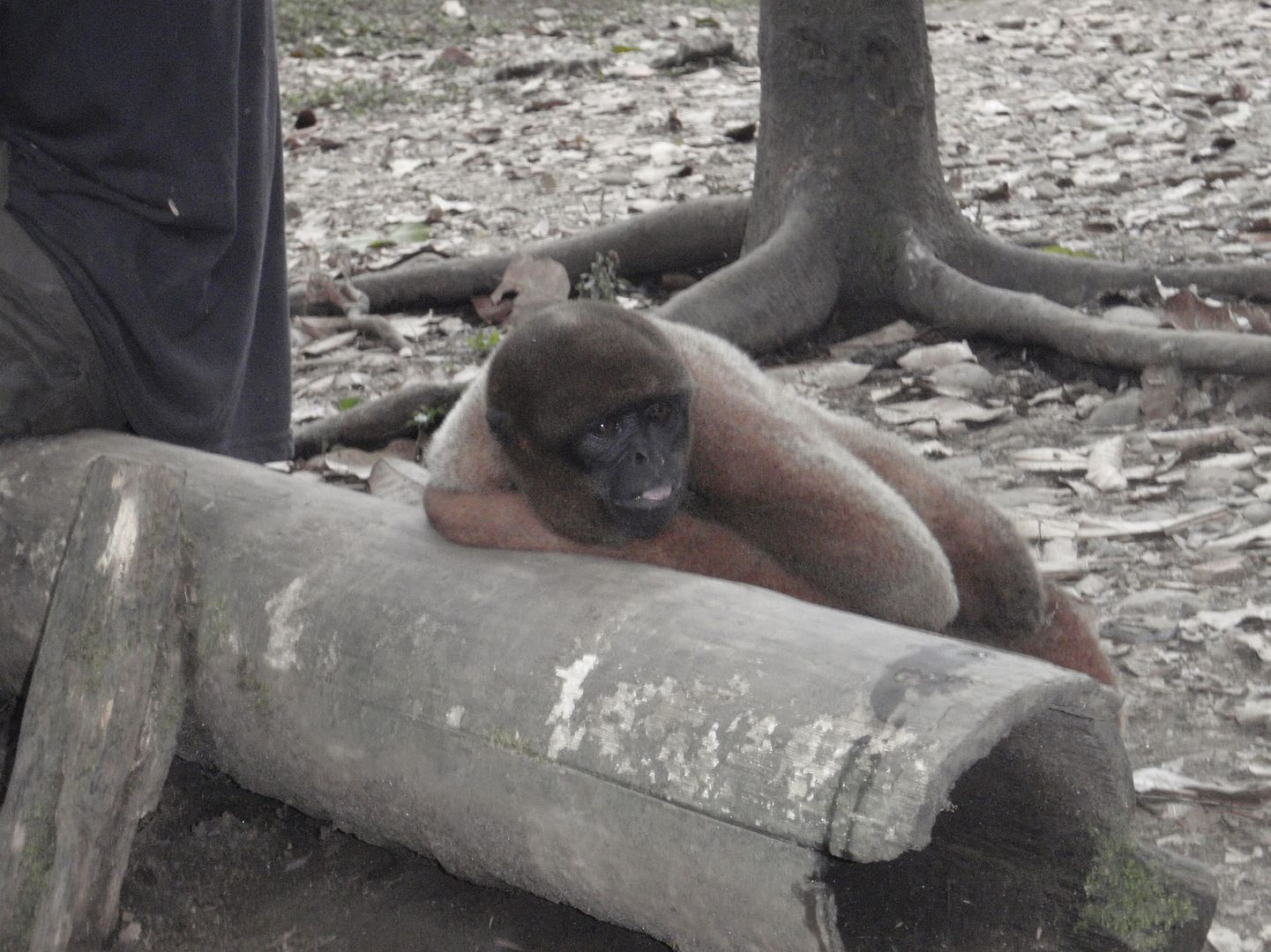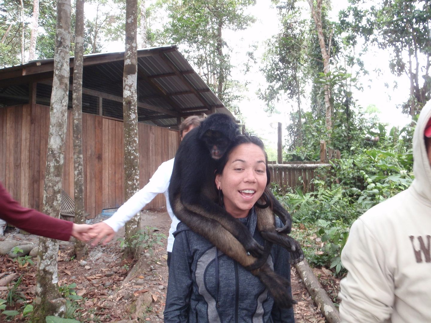 Our first stop was the monkey rescue center called ¨Centro de Rescate los Monos¨or in English ¨Monkey Rescue Center¨ haha. As our truck pulled up outside there were monkeys on the dirt road before we had even entered, so naturally Lynz and I grabbed our cameras and chased them around for about 10 mins until we realized that if we just listened to our guide, the smarter thing would be to go INSIDE the center where there are like a hundred monkeys and no chasing involved. This monkey palace was not in anyway in closed and the monkeys are free to come and go as they please but they never go because nothing beats free, hand feed bananas. So after walking thru the front gate a monkey walks straight up to Lynz on its two hind legs, grabs her arm and hoists itself up onto her neck just like child riding on its parents shoulders.