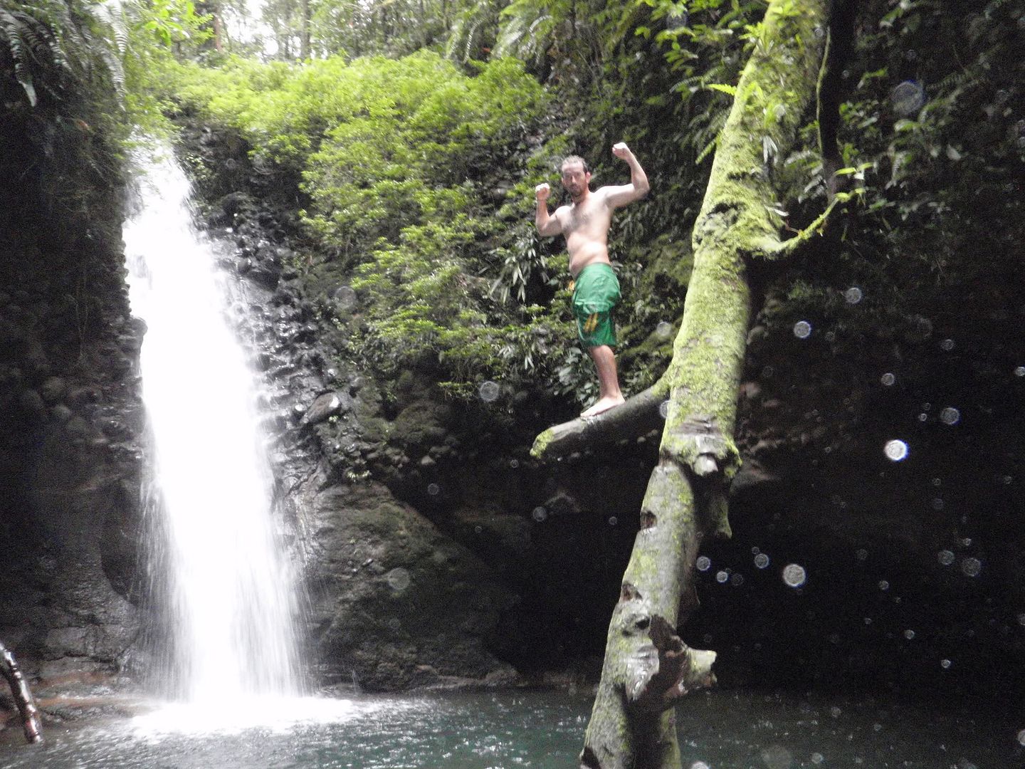 The waterfall was breathtaking, it was crystal clear blue water with beautiful vine covered cliffs surrounding it. A tree had at some point fallen into the water next to the falls but came to rest vertically so you could swim over to the tree, climb up it and jump into the pond, which everyone did several times.