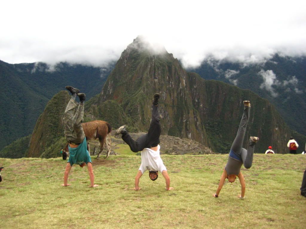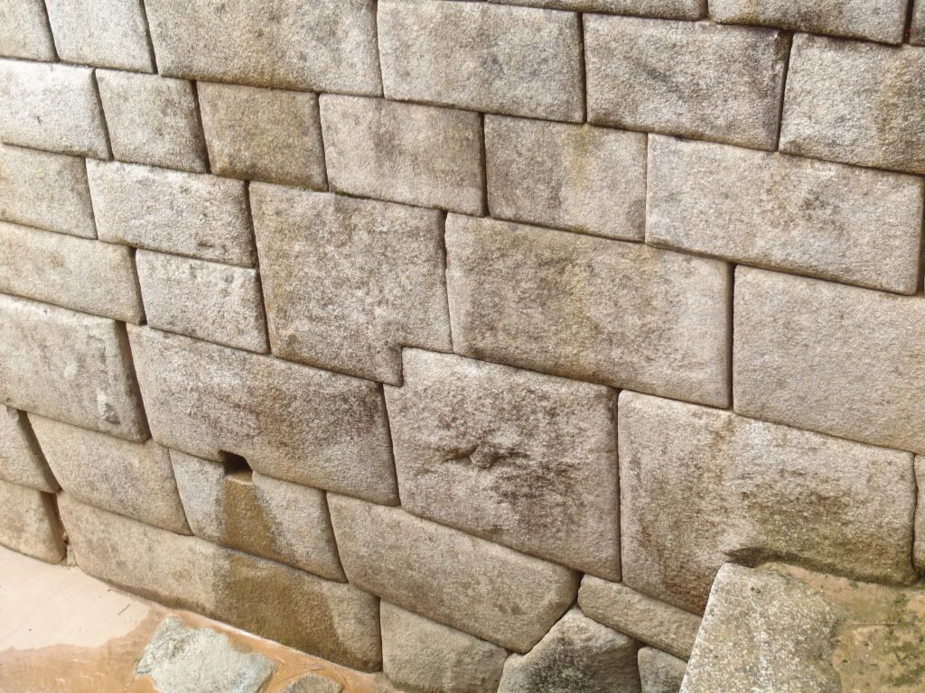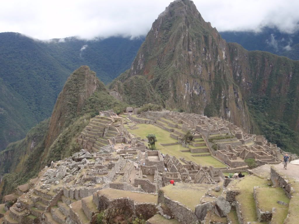Everyone in the group was pretty upset, we had planned, paid for and hiked all this time for a five minute glimpse of the the ruins and now there was nothing to see. We went´down to the area where you have to show your permit to get into the ruins and then fallowed our guide into one of the buildings where he gave us a half an hour or so long history of Machu Picchu. When we came out of the building to our surprise the weather had cleared and the clouds had lifted! We began to walk around the ruins in utter amazement! The pictures you see and the articles you read do not even begin to paint the picture of how incredible this place is. This place must be made of millions of stones, EVERY SINGLE ONE has been hand carved, sanded, carried and fit with the rest, and the most unfathomable part is that the majority of these stones weigh hundreds if not thousands of pounds! Some of the larger ones must weigh more then your average car. But that is only the beginning, as you walk around you begin to see aqueducts flowing through most of the ruins, each one perfectly measured out to regulate the flow of water, descending only a fraction of an inch to insure the water never puddles up or runs too fast. The way these networks of aqueducts are set up is that they run under most of the buildings meaning that Machu Picchu was planned before it was ever built. What I mean is that the Inkas didn´t just build a new building when one was needed, they had this whole place planned to the fraction of an inch before the first rock was ever lifted!