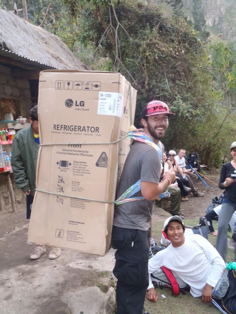 As we reached one of the last stops to take a break before heading to camp we came across a porter carrying a refrigerator!!! I joke you not, this guy was hiking the trail with a refrigerator on his back. For kicks Sean hoisted it up on his back giving the Peruvian locals a good laugh.