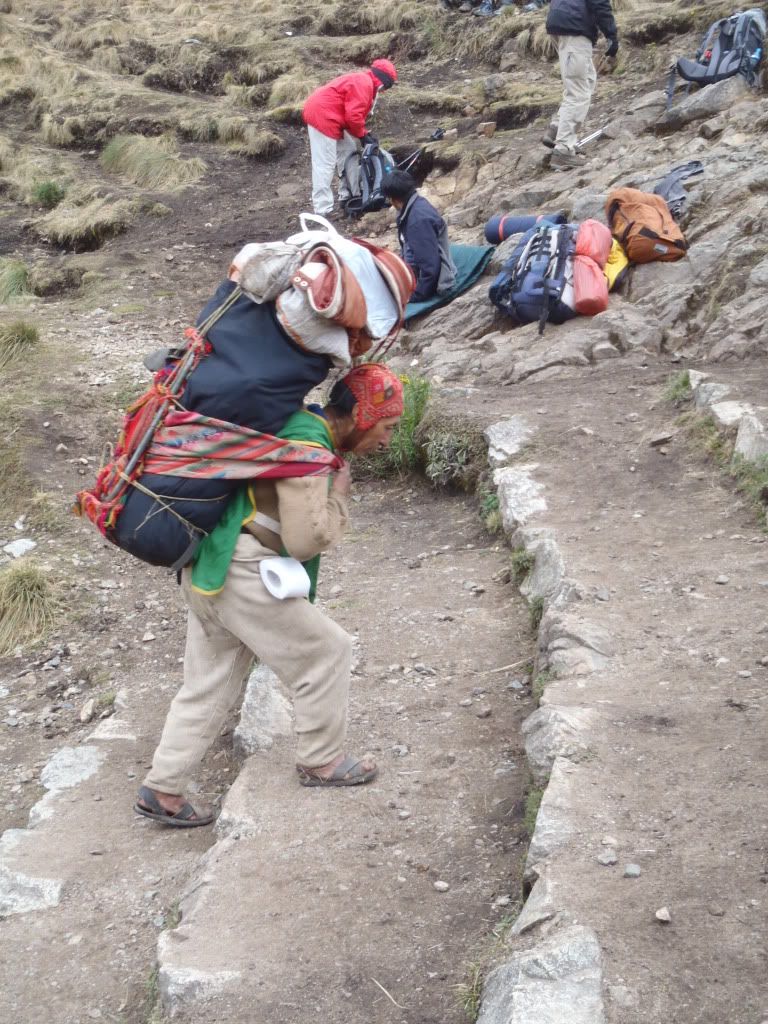 As we hiked up and down and in between the Andean mountain ranges every moment or so someone behind us would call out ´porter!´ and we would all move toward the left and let the porters pass. Now let me tell you about these guys - they are like dark, little Latin versions of superman! Although I they are many regulations that prevent the porters from carrying too much weight these guys still carried quite the load. On average the porters were carrying somewhere between 60-80 lbs (this was probably about half of their weight... Little guys :-)
