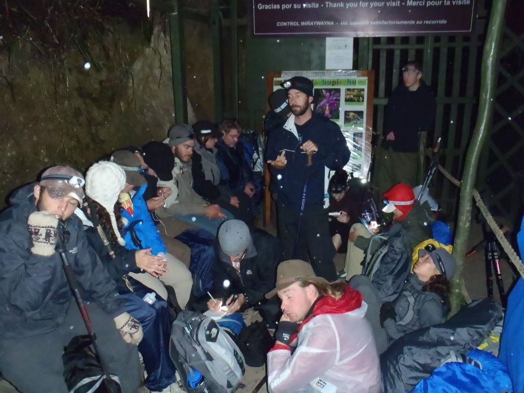 The camp on the final night was only a few hours from Machu Picchu and the plan was to wake up at 330 in the morning to make sure we were the first group to get on the trail and arrive at the ruins by sunrise. Well around 10pm that night it started raining and it didn´t let up by the time our wake up call came at 330am. We reluctantly got out of bed and packed up camp in the downpour. We ran down the hill to the checkpoint for the final portion of the trail that you once again have to show your trail permit and your passport for. Only problem is the checkpoint person doesn´t show up until 530am so everyone just has to stand around in the rain and the dark until then. Luckily for us we were the first ones to arrive at the checkpoint so we were able to get under the roof and out of the rain, but another 200 or so people weren´t so lucky and were stuck in the freezing rain for the long wait.